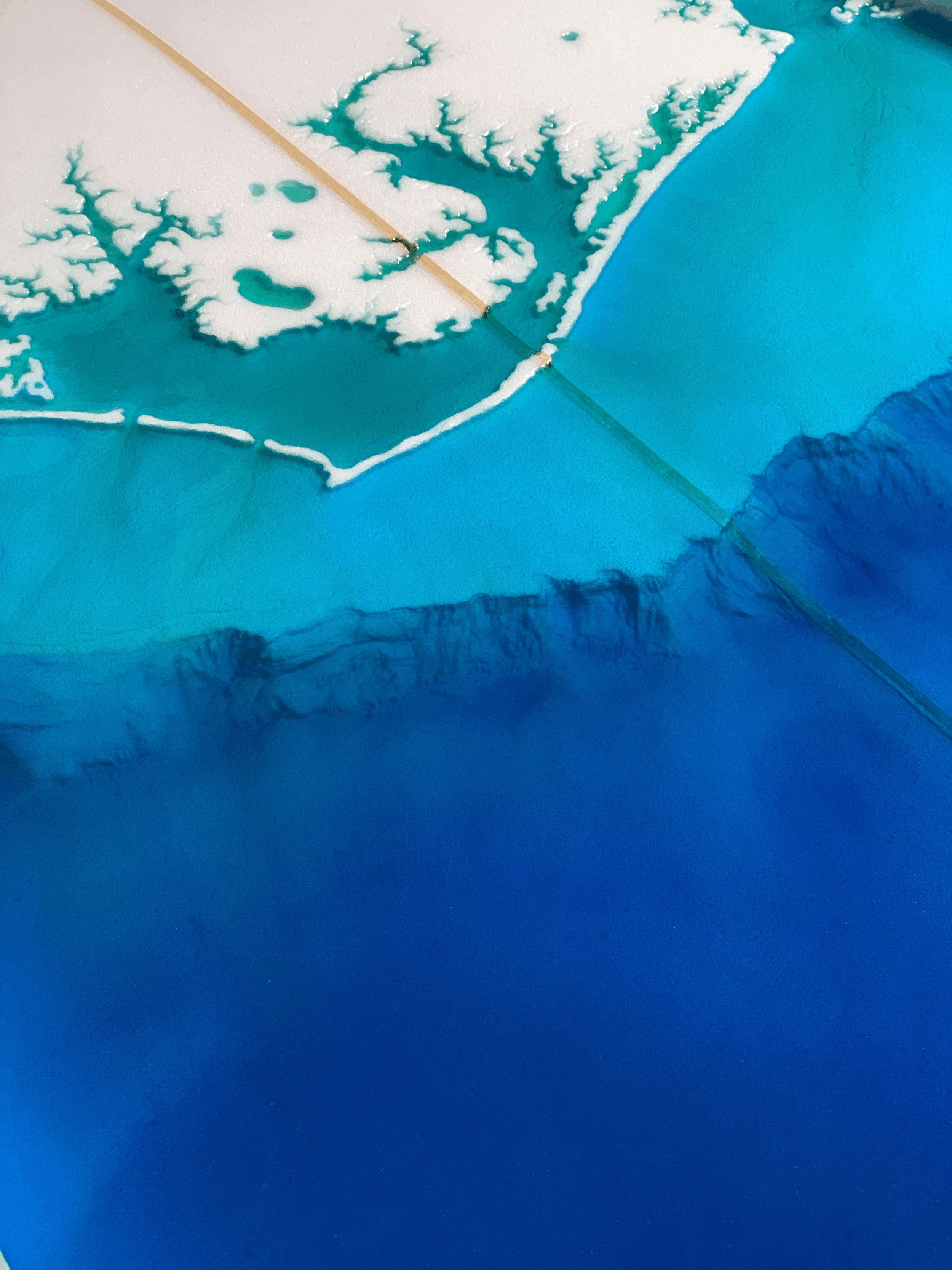 Though she is an East Coast-based artist, it was while living in Northern California that she became immersed in the art and culture of surfboard shaping. It was here, amongst the redwoods and cedar trees, she first began to consider the toll of the surfboard shaping process on the environment, as well as what happens to a board when it is no longer useable. After a few years of shaping and working alongside some incredibly talented shapers, Kat was able to approach these questions through the lens of both a shaper and an artist. It began slowly, using scraps from the shaping bay to sculpt small artworks, eventually expanding to using entire boards to sculpt large-scale, highly detailed, bathymetric maps of varying coastlines and bodies of water.